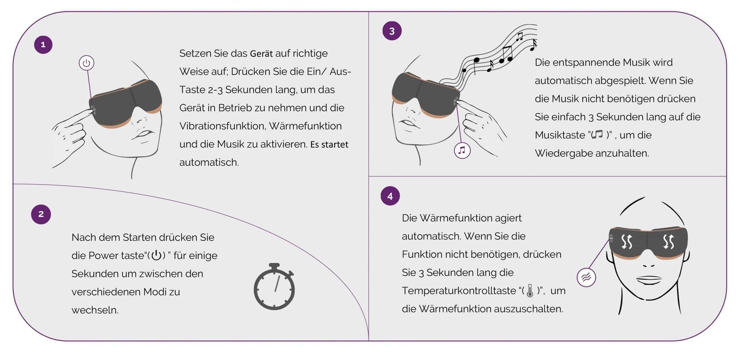 Dieses Gerät passt sich an jede Gesichtsform an, was die Anwendung sehr bequem macht. Außerdem hat dieses Gerät gesundheitsfördernde Eigenschaften und ist für Personen die unter Pseudomyopie leiden, viel Zeit vor Bildschirmen wie Computer, TV, etc. verbringen, oder nach langen sportlichen Aktivitäten eine Entspannung der Augen benötigen, optimal geeignet. Dieses Gerät hat nicht nur diese positiven Eigenschaften, sondern verleiht den Augen Schönheit, indem es vorhandene Augenringe und Augenfältchen im Gesicht entfernt.
