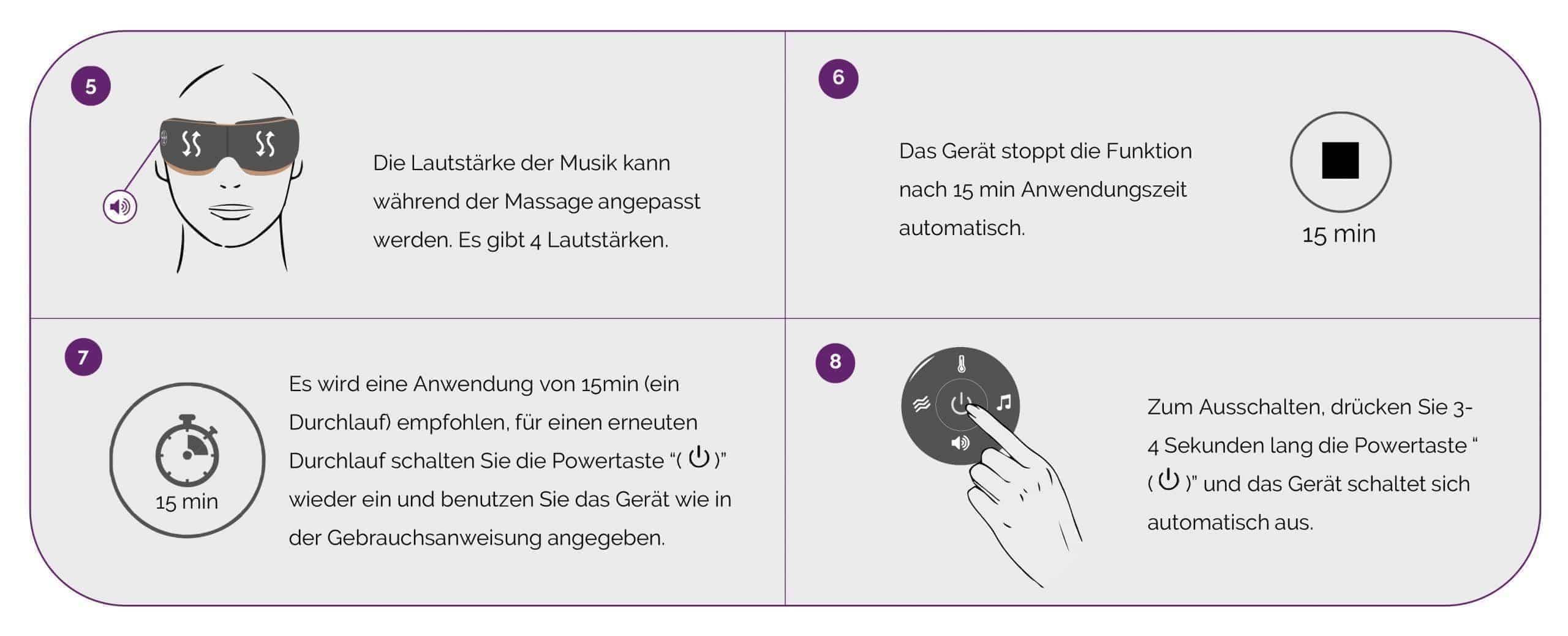 Bei jeder Anwendung wird eine Anwendungsdauer von 15 min empfohlen, das Gerät schaltet sich automatisch, bei standardmäßigem Gebrauch nach 15 min Funktionszeit, ab.